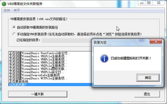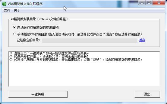 如果你的VB6.0安裝路徑不是默認(rèn)的,請(qǐng)手動(dòng)指定VB6.0安裝目錄后,在點(diǎn)擊一鍵關(guān)聯(lián)。