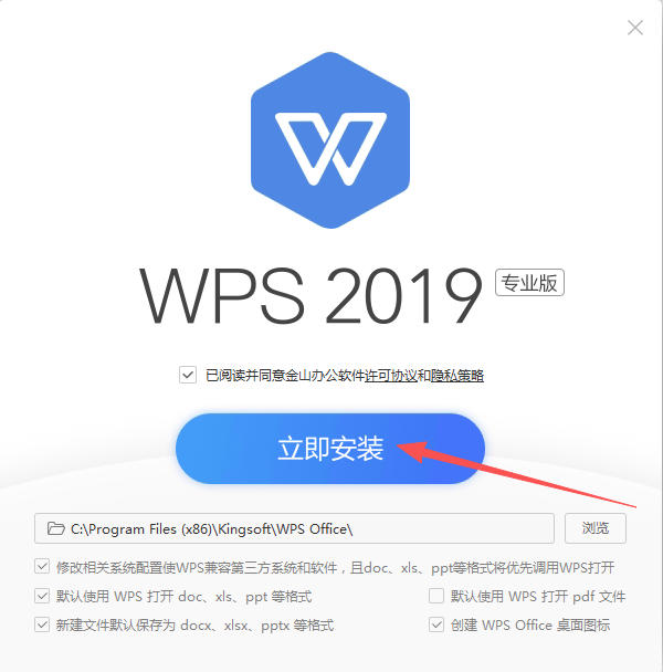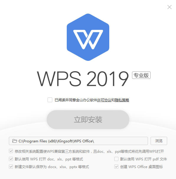 3、勾選已閱讀并同意金山辦公軟件許可協(xié)議和隱私策略。